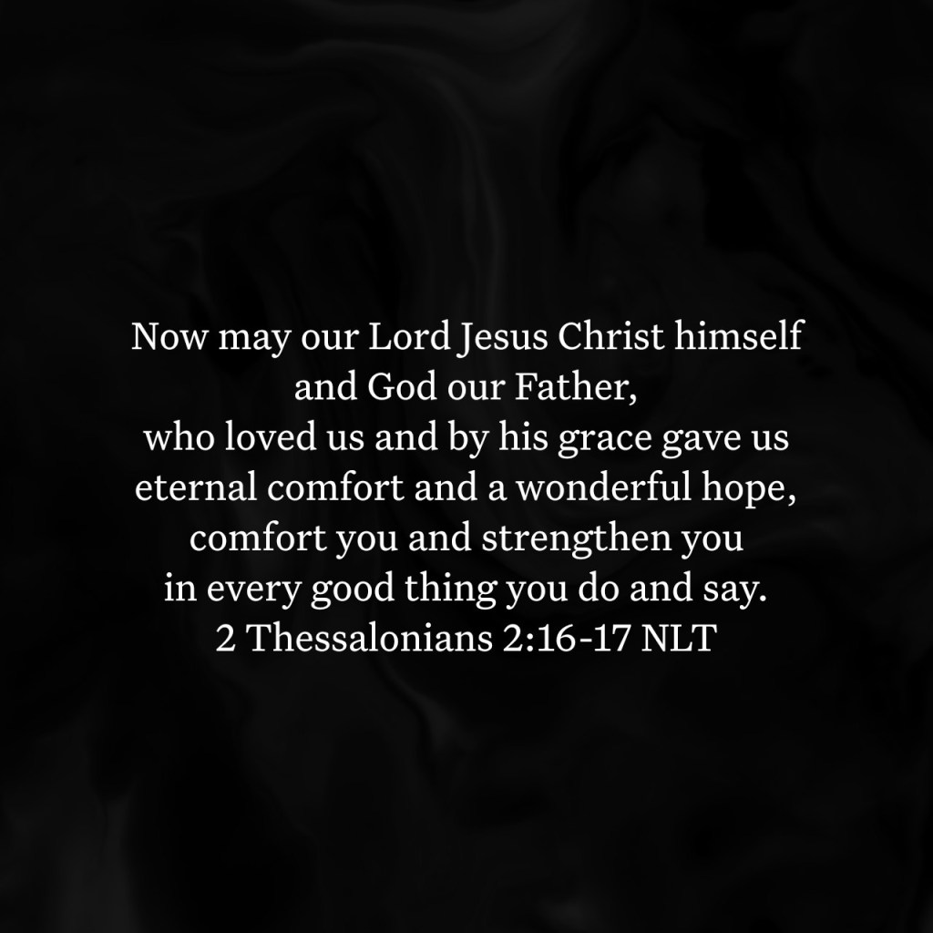 Now may our Lord Jesus Christ himself and God our Father, who loved us and by his grace gave us eternal comfort and a wonderful hope, comfort you and strengthen you in every good thing you do and say.