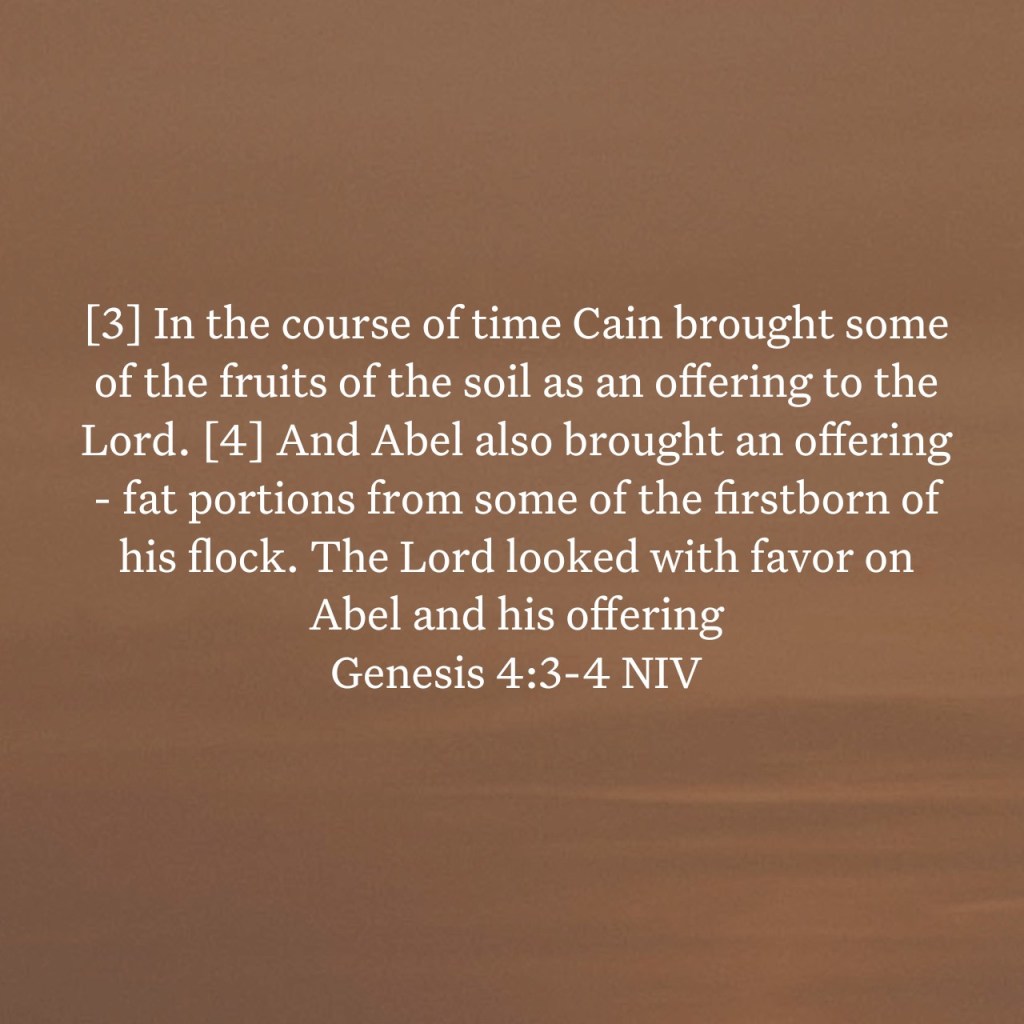 [1] Adam made love to his wife Eve, and she became pregnant and gave birth to Cain. She said, “With the help of the Lord I have brought forth a man.” [2] Later she gave birth to his brother Abel. Now Abel kept flocks, and Cain worked the soil. [3] In the course of time Cain brought some of the fruits of the soil as an offering to the Lord. [4] And Abel also brought an offering—fat portions from some of the firstborn of his flock. The Lord looked with favor on Abel and his offering, [5] but on Cain and his offering he did not look with favor. So Cain was very angry, and his face was downcast. [6] Then the Lord said to Cain, “Why are you angry? Why is your face downcast? [7] If you do what is right, will you not be accepted? But if you do not do what is right, sin is crouching at your door; it desires to have you, but you must rule over it.” [8] Now Cain said to his brother Abel, “Let’s go out to the field.” While they were in the field, Cain attacked his brother Abel and killed him. [9] Then the Lord said to Cain, “Where is your brother Abel?” “I don’t know,” he replied. “Am I my brother’s keeper?” [10] The Lord said, “What have you done? Listen! Your brother’s blood cries out to me from the ground. [11] Now you are under a curse and driven from the ground, which opened its mouth to receive your brother’s blood from your hand. [12] When you work the ground, it will no longer yield its crops for you. You will be a restless wanderer on the earth.”