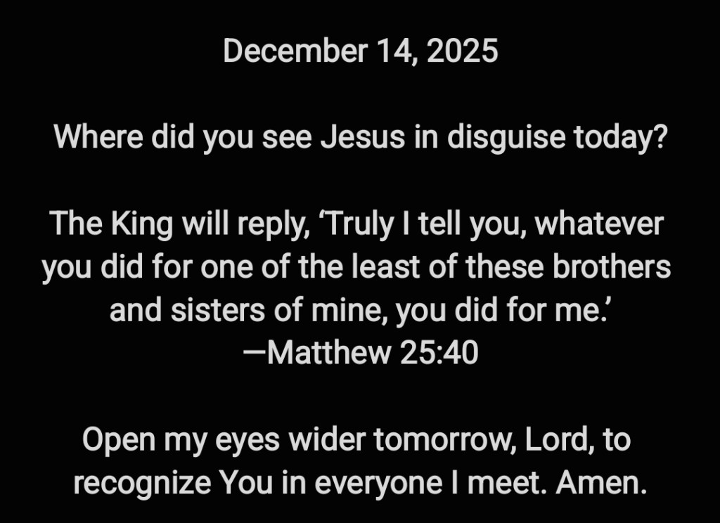 Open my eyes wider tomorrow, Lord, to recognize You in everyone I meet. Amen.