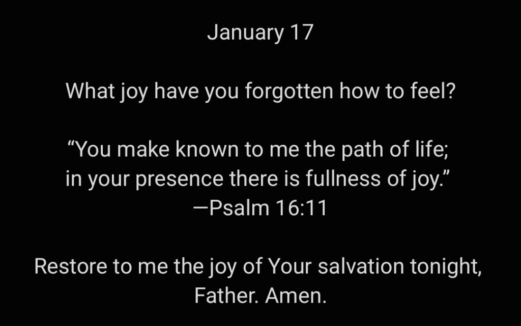 Restore to me the joy of Your salvation tonight, Father. Amen.