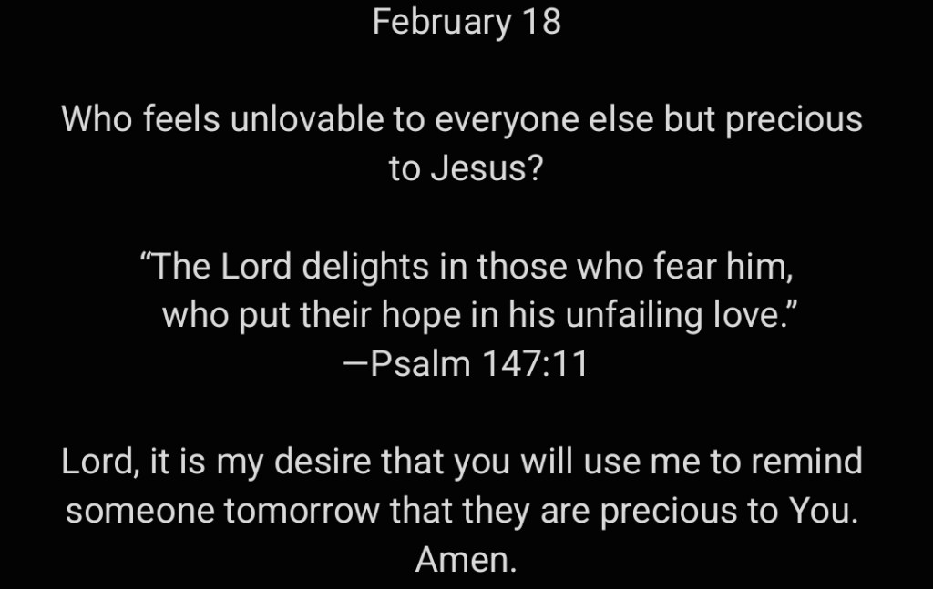 Lord, it is my desire that you will use me to remind someone tomorrow that they are precious to You. Amen.