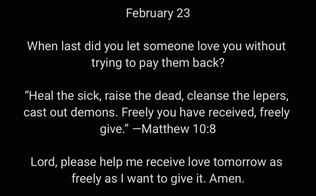 Lord, please help me receive love tomorrow as freely as I want to give it. Amen.