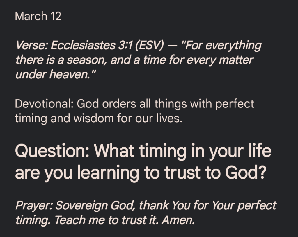 Prayer: Sovereign God, thank You for Your perfect timing. Teach me to trust it. Amen.