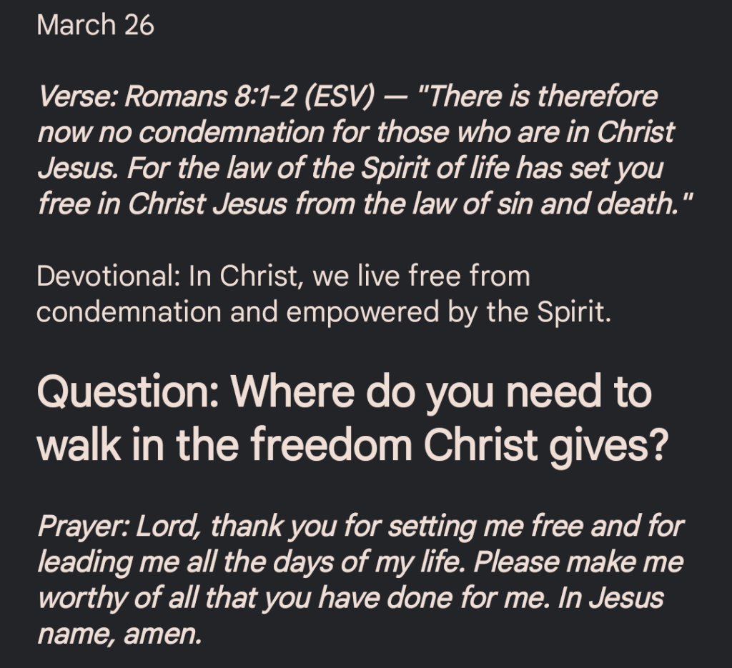 Verse: Romans 8:1-2 (ESV) — “There is therefore now no condemnation for those who are in Christ Jesus. For the law of the Spirit of life has set you free in Christ Jesus from the law of sin and death.”