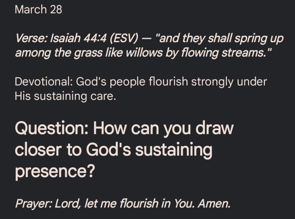 Verse: Isaiah 44:4 (ESV) — “and they shall spring up among the grass like willows by flowing streams.”