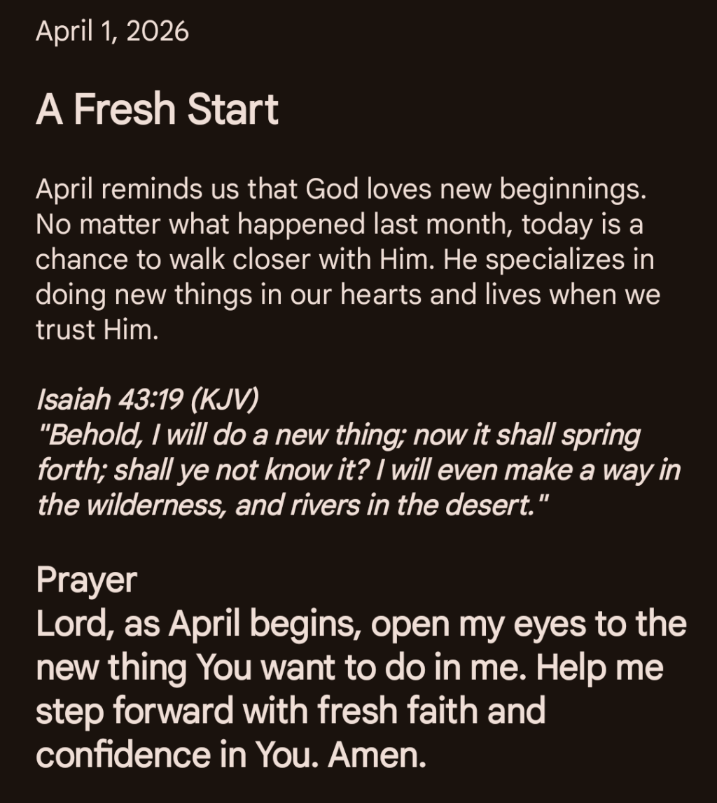April reminds us that God loves new beginnings. No matter what happened last month, today is a chance to walk closer with Him. He specializes in doing new things in our hearts and lives when we trust Him.