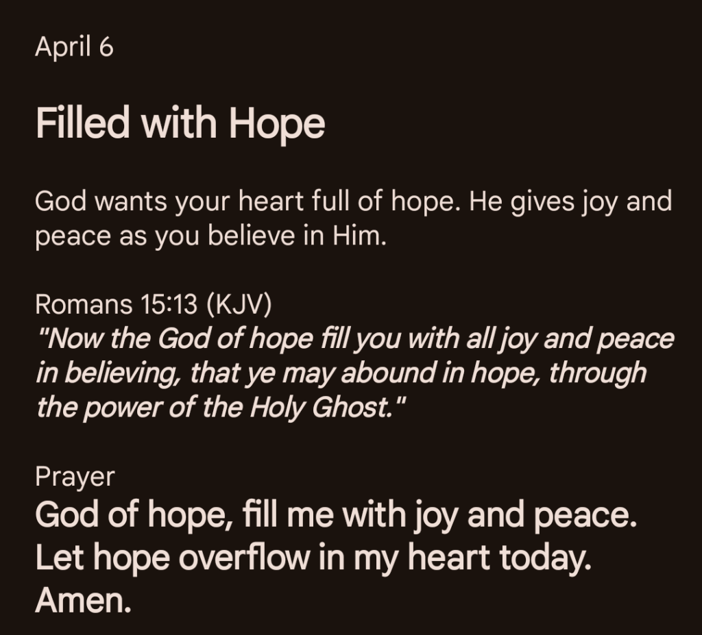God of hope, fill me with joy and peace. Let hope overflow in my heart today. Amen.