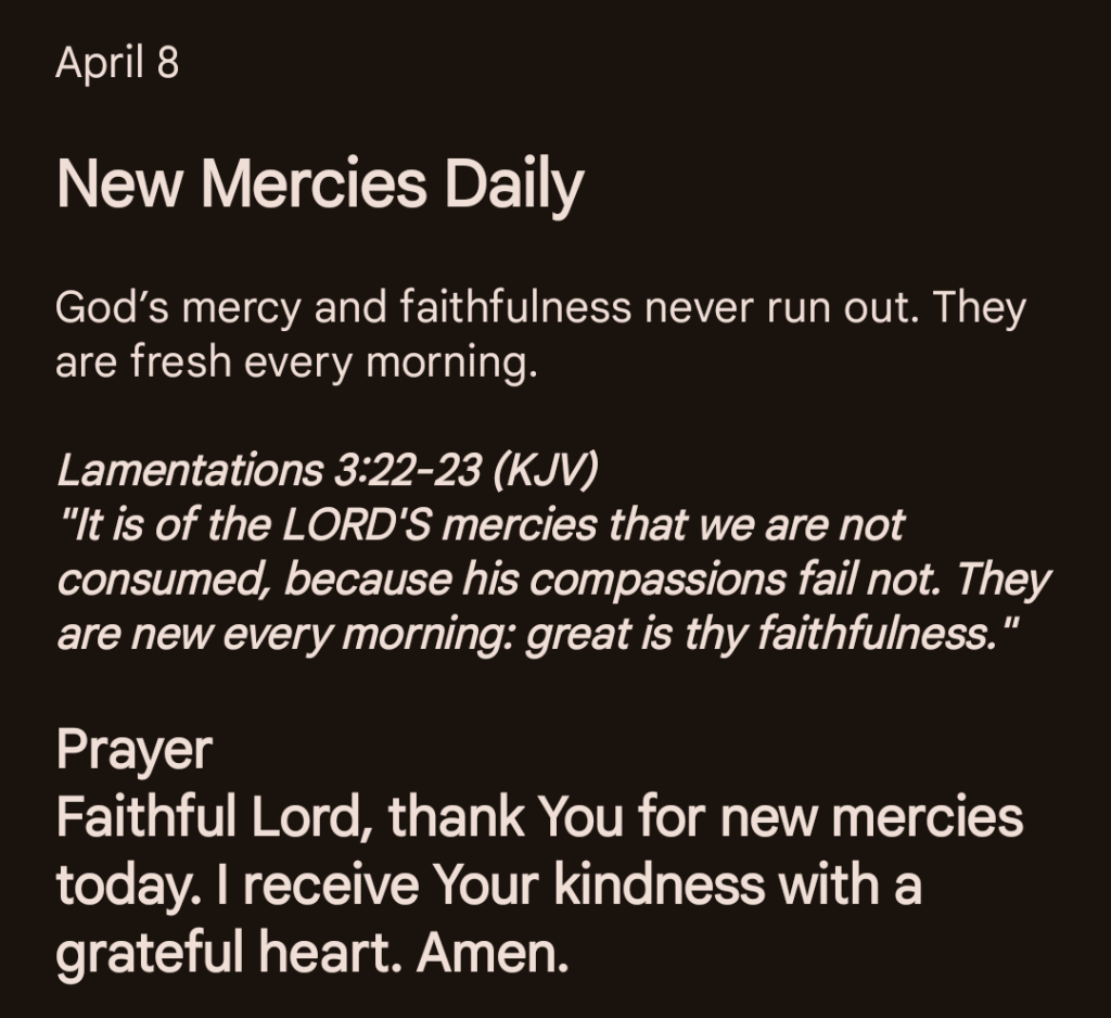 Faithful Lord, thank You for new mercies today. I receive Your kindness with a grateful heart. Amen.